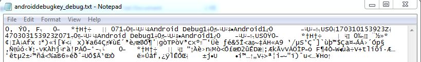 keytool -exportcert -alias androiddebugkey -keystore debug.keystore > c:\openssl\bin\androiddebugkey_debug.txt