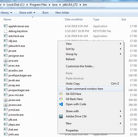 Bước 4: Trong thư mục bin của bộ JDK, Bấm giữ phím Shift và click phải chuột rồi chọn Open command window here.