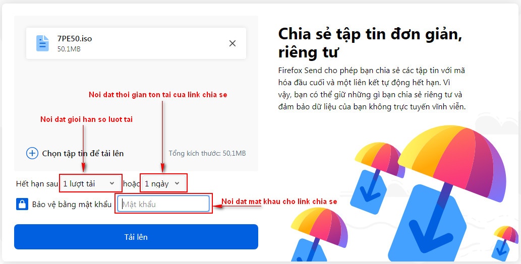 Ngoài ra, công cụ này còn cho phép người dùng thiết lập giới hạn về về thời gian tồn tại, số lượt tải, mật khẩu của file chia sẻ.